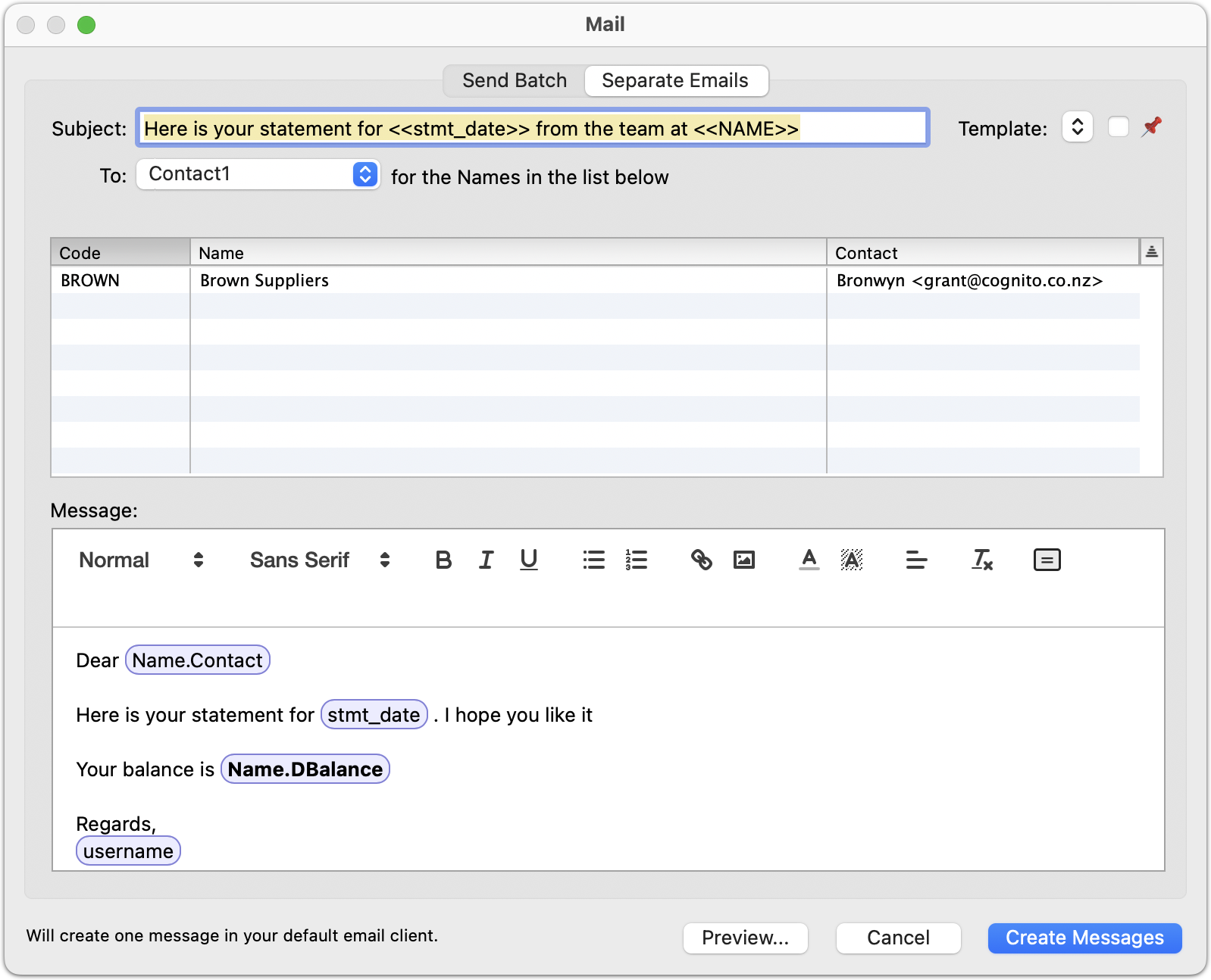 Note: The method of sending email is determined by the Emailing Preference. If the default option Create Message in the system email client option is selected, emails will be created in your preferred email client (Outlook, Mail etc), and you will need to send them manually from this. If the Send messages directly via a mail server option is set, the emails will be sent immediately with no record in your email client (unless you have also set the BCC option).